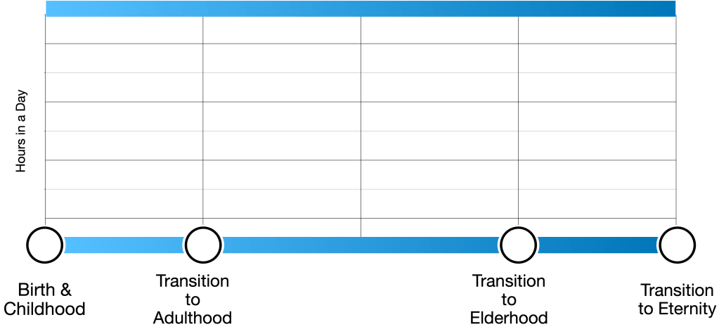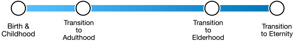 Draw a horizontal line to represent your life. Segment the line into three parts to represent your childhood, adulthood, and elderhood. Mark how old you were/will be as you transition/expect to transition to the next stage of life. (You should have four dots to represent your birth, your age when you became an adult, when you became (expect to become) an elder, and the fourth dot on the far right end of the line representing your age when you expect to die and transition to eternity.)